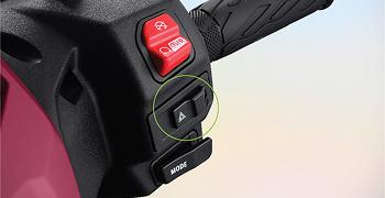 A switch on the left brake lever activates the system to lock the rear wheel and keep the e-ACCESS in place when the rider stops. This enhances comfort and convenience when stopped at a street light or in traffic.